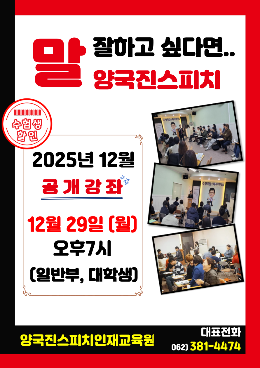 - 1.교육일시: 2025년12월9일(화) 2.교육장소: 양국진스피치인재교육원상무센터 3.교육대상: 성인부교육생 4.교육내용: 스피치