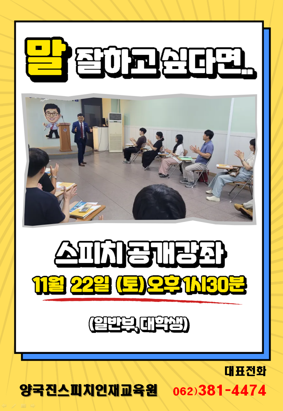 1.교육일시: 2025년10월29일(수) 2.교육장소: 양국진스피치인재교육원상무센터 3.교육대상: 성인부교육생 4.교육내용: 스피치